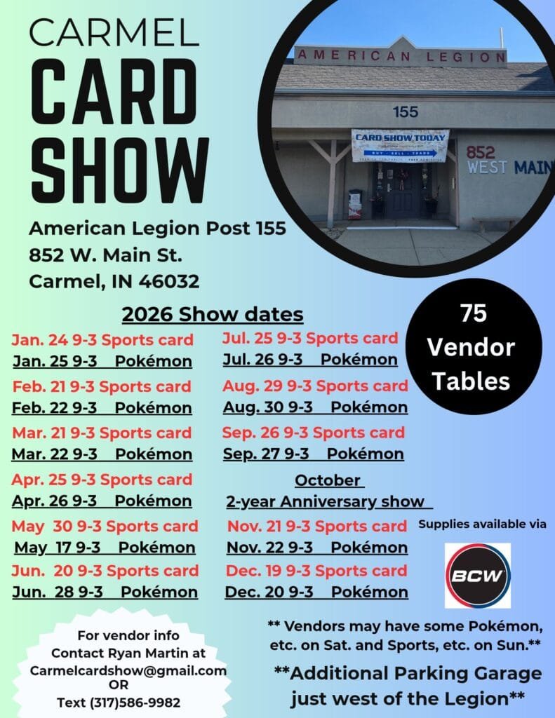 Please join us Saturday February 21st (Sports) and Sunday February 22nd (Pokemon) from 9am to 3pm at the Carmel American Legion Post 155 located at 852 West Main St. Carmel, IN 46032.